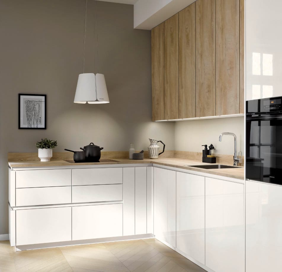 Deze keuken straalt de rust en eenvoud uit die zo typerend zijn voor de Scandinavische stijl. De combinatie van tijdloos wit, een warme houtlook, en matwitte fronten maakt van deze keuken een lichte en jeugdige ruimte, vol Scandinavische charme. Het ontwerp voelt niet alleen fris, maar ook slim aan – de hoge deuren van de wandkast lijken op het eerste gezicht gewoon fronten, maar verbergen in werkelijkheid een strakke opstelling van ingebouwde apparatuur.
